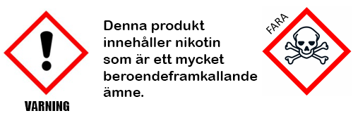Om ett barn eller husdjur råkat få i sig nikotin, oavsett mängd – sök omedelbart medicinsk vård. Nikotin kan vara mycket farligt, särskilt för barn.